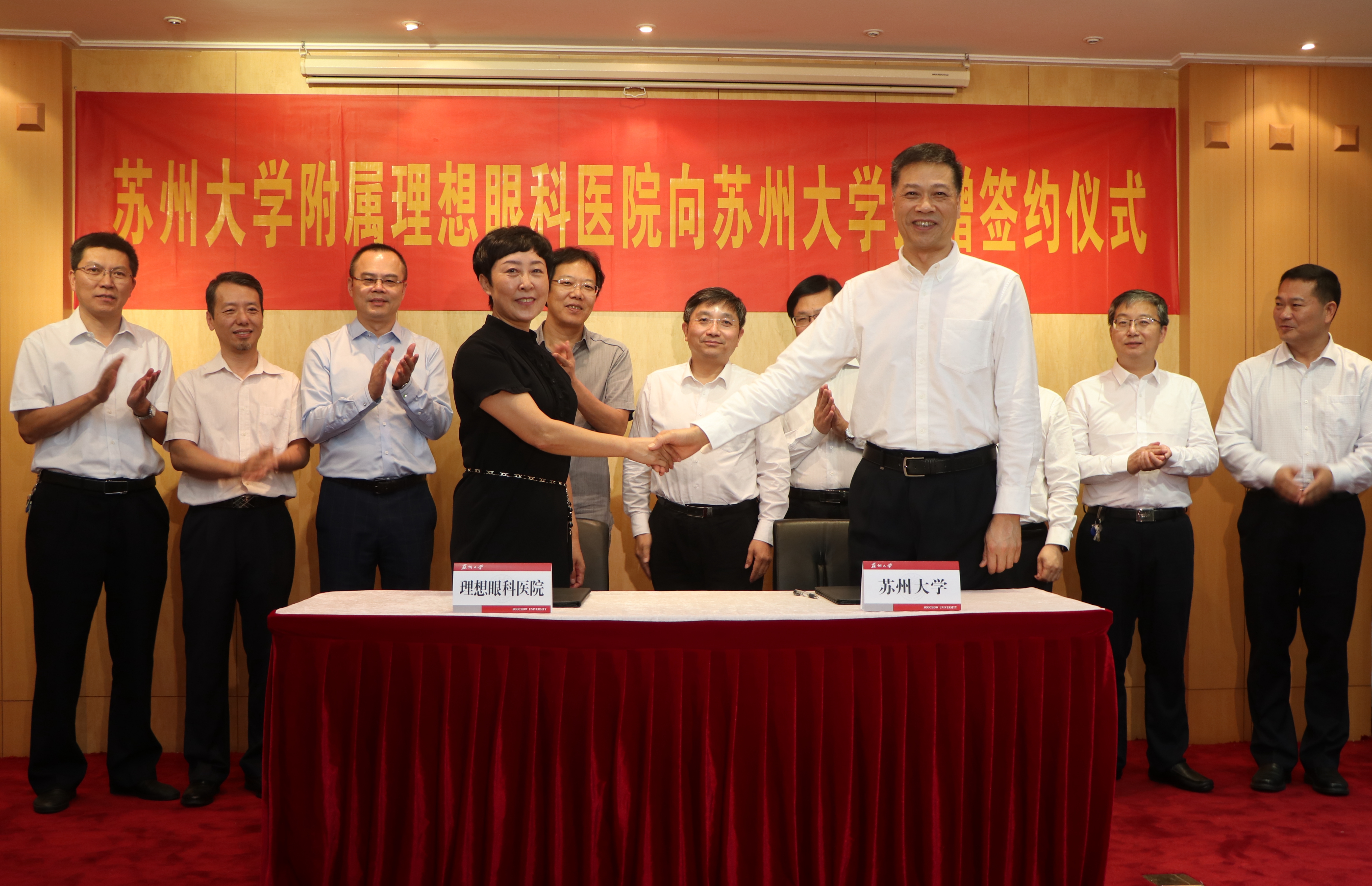 宋鄂院长和杨一心副校长分别代表附属理想眼科医院和苏州大学签订捐赠协议,向苏州大学捐赠1000万元人民币。