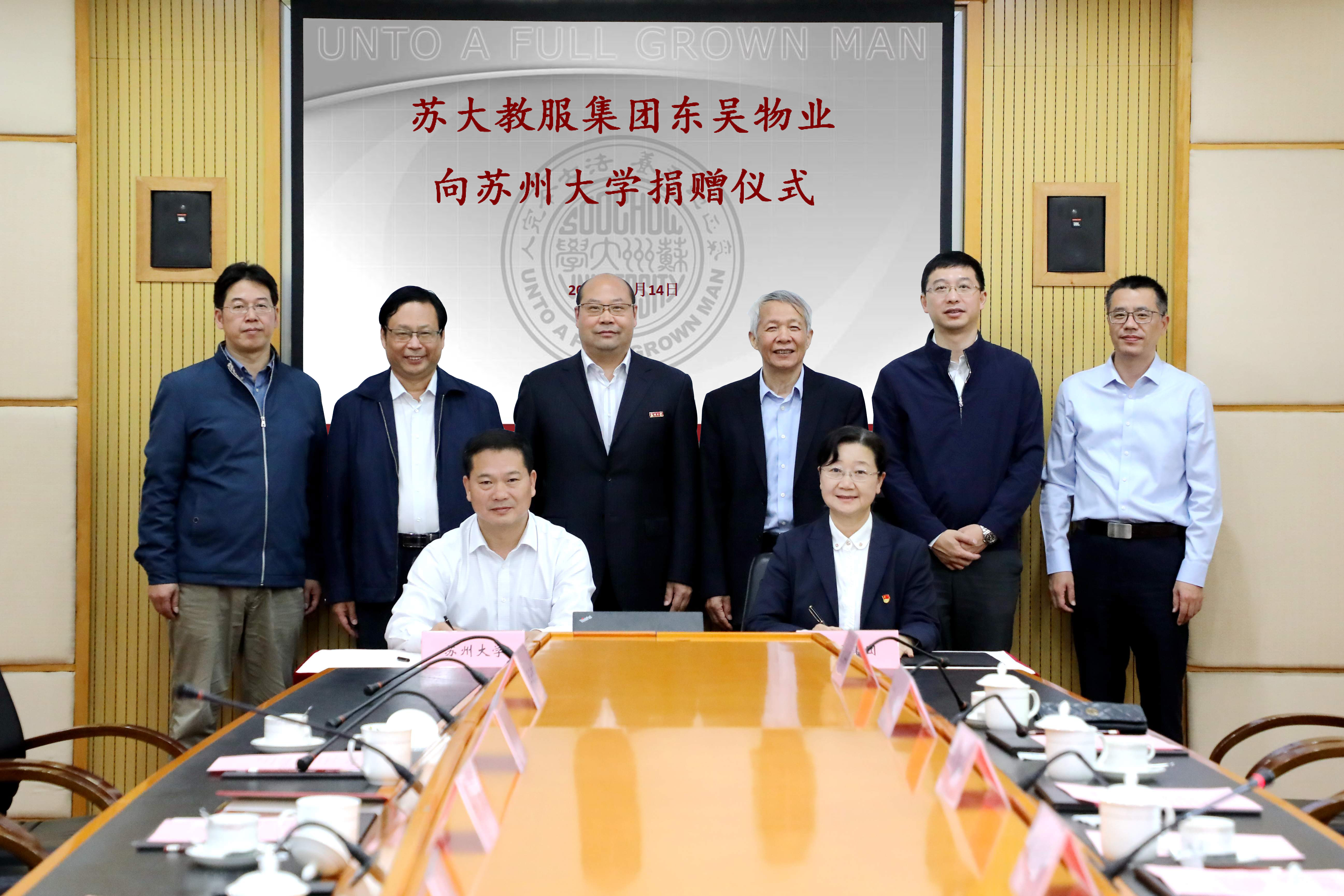 10月14日下午,苏大教服集团东吴物业公司捐赠仪式在天赐庄校区红楼会议中心举行。苏大教服集团董事长、总裁、东吴物业董事长韦曙和,苏大教服公司党委书记、集团副总裁、东吴物业总经理陈爱萍以及苏教服集团部分高管,我校党委副书记刘标,以及学校相关职能部门负责人等出席捐赠仪式。捐赠仪式由我校总会计师周高主持。