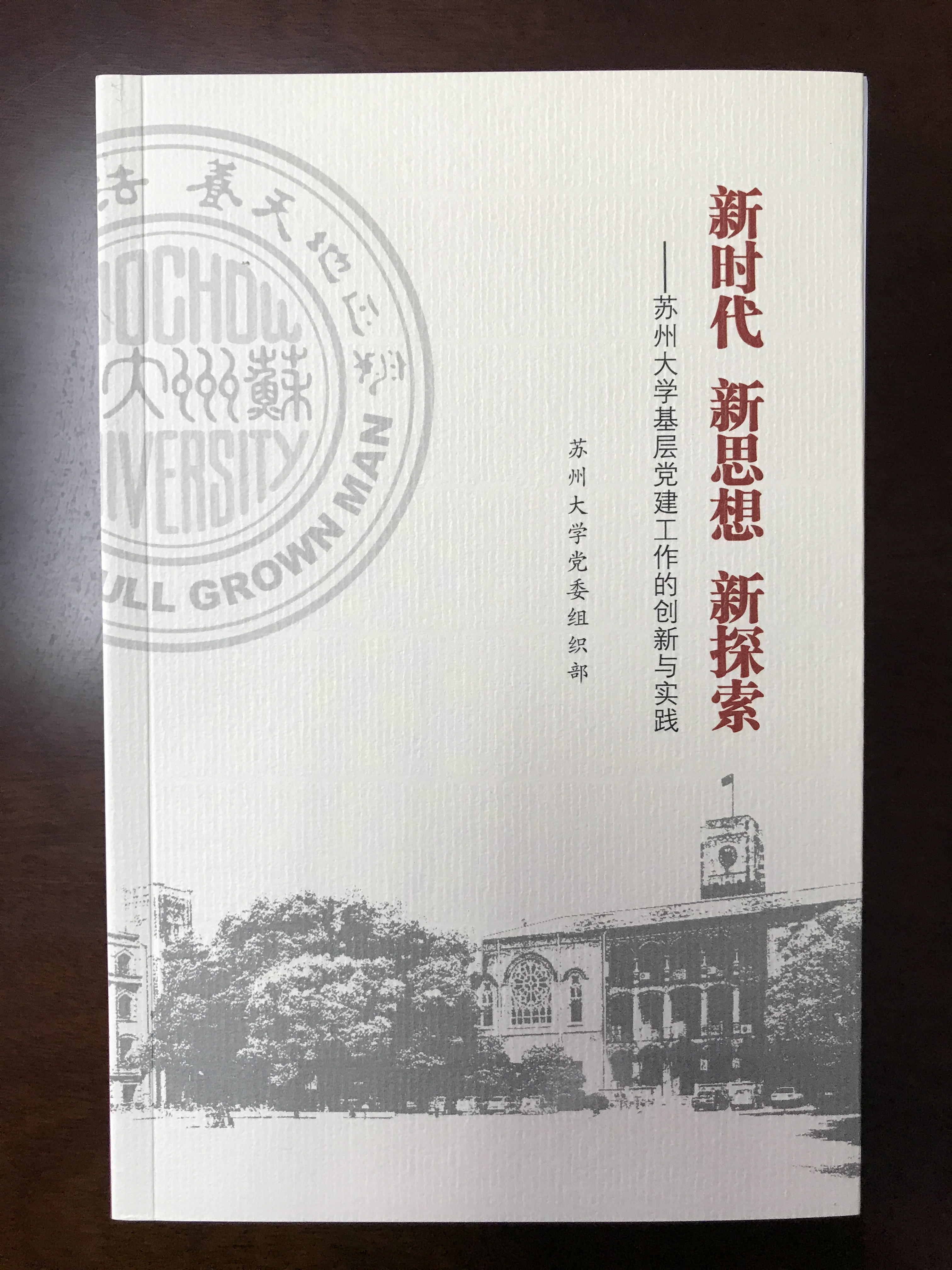 近日,由苏州大学党委组织部负责编撰的《新时代 新思想 新探索——苏州大学基层党建工作的创新与实践》刊印成册,以此向苏州大学双甲子华诞献礼。 近年来,苏州大学党委坚持以习近平新时代中国特色社会主义思想为指导,深入贯彻新时代党的建设总要求和新时代党的组织路线,通过大力实施“固本强基”“堡垒聚力”“头雁领航”“先锋旗帜”“内涵提升”五大工程,学校基层党组织的政治功能不断强化,组织力不断提升,有力推动了学校内涵式高质量发展和“双一流”建设,也涌现出了众多先进基层党组织和优秀共产党员,形成了一批可复制、可借鉴、可推广的优秀党建工作方法和典型案例。