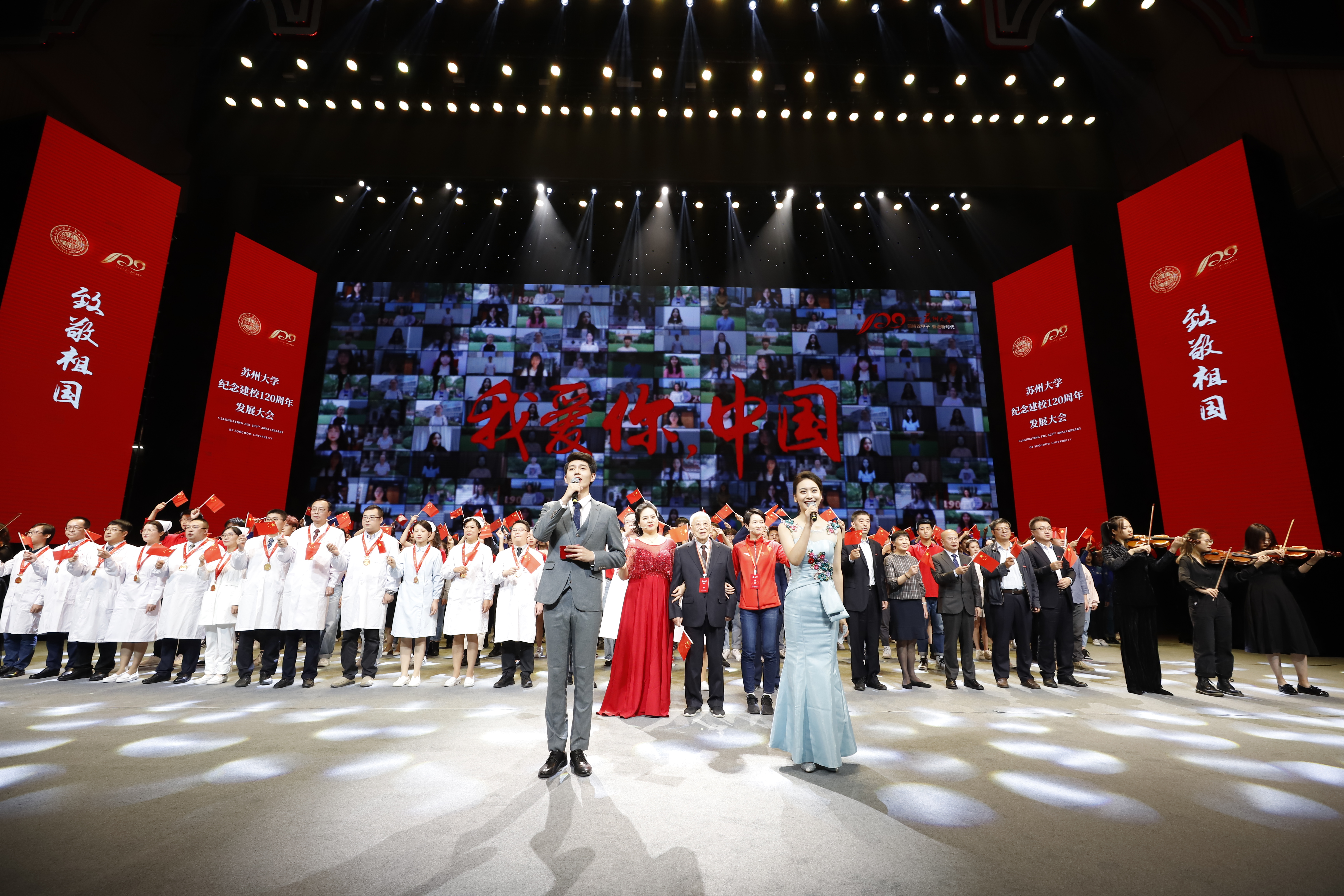 伴随着熟悉的旋律,现场不少师生、嘉宾不约而同地合唱。政治与公共管理学院大二学生马恒是大会现场的志愿者。他说:“能够参与和见证苏大120周年活动,深感荣幸和自豪。会场红旗飘扬,当响起《我的祖国》熟悉的旋律时,所有人集体高唱,真切感受到作为新时代青年人要肩负起爱国荣校、振兴家邦的使命和担当。”