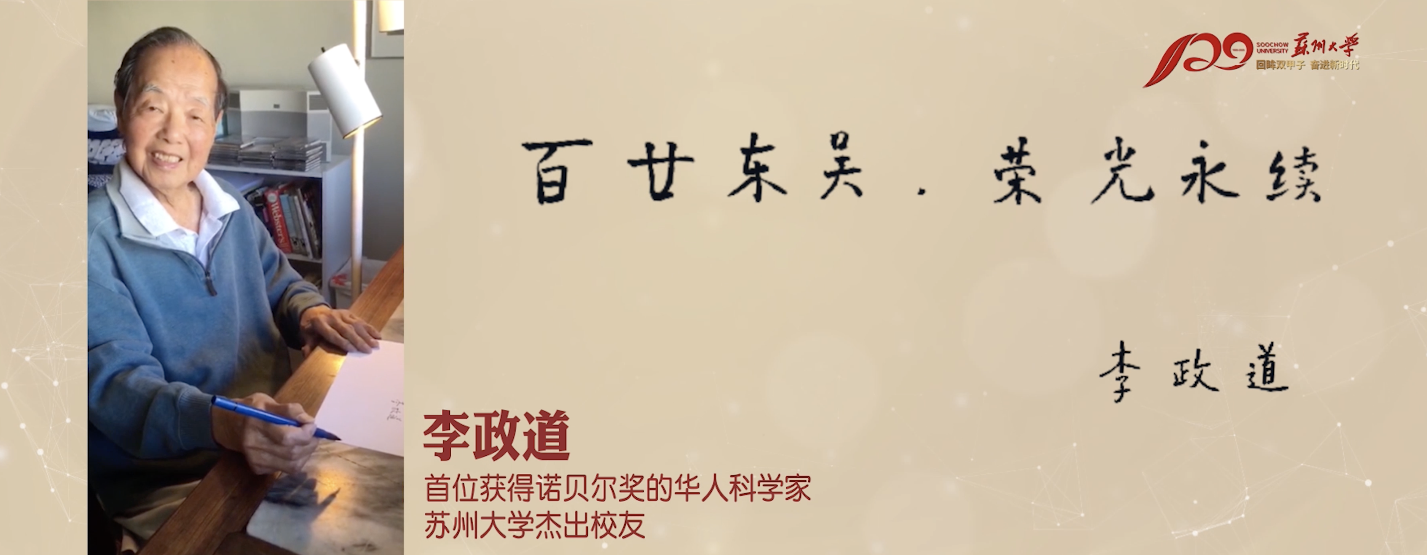 李政道博士一直关心母校的建设发展,心系祖国青年学生成长成才。为了这次发展大会,他特意录制了一段视频,并亲笔书写了 百廿东吴,荣光永续 八个大字赠予母校。各地校友会也纷纷通过“云视频”的方式,为母校120周年华诞送上祝福。