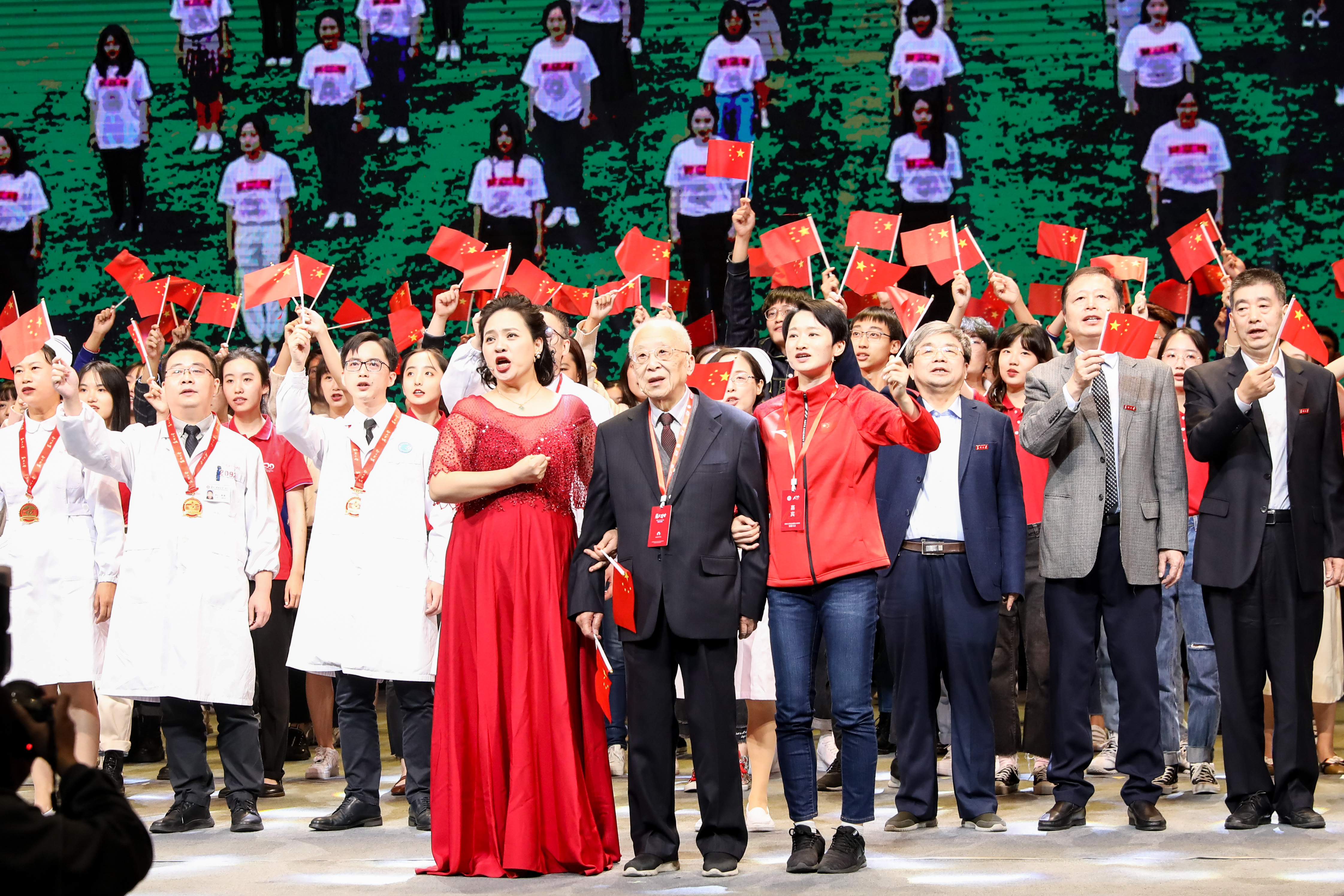 一条大河波浪宽,风吹稻花香两岸 ……随着歌曲《我的祖国》响起,再次将发展大会的现场推向高潮。会场中,已90岁高龄、从事科研工作 68 年的中国工程院院士、苏州大学现代光学研究所研究员潘君骅起身领唱。随后,奥运冠军、苏州大学校友吴静钰挥舞国旗起身歌唱。苏州大学音乐学院声乐系老师、江苏省音乐家协会会员董艺媛的女高音激昂澎湃,点燃全场!