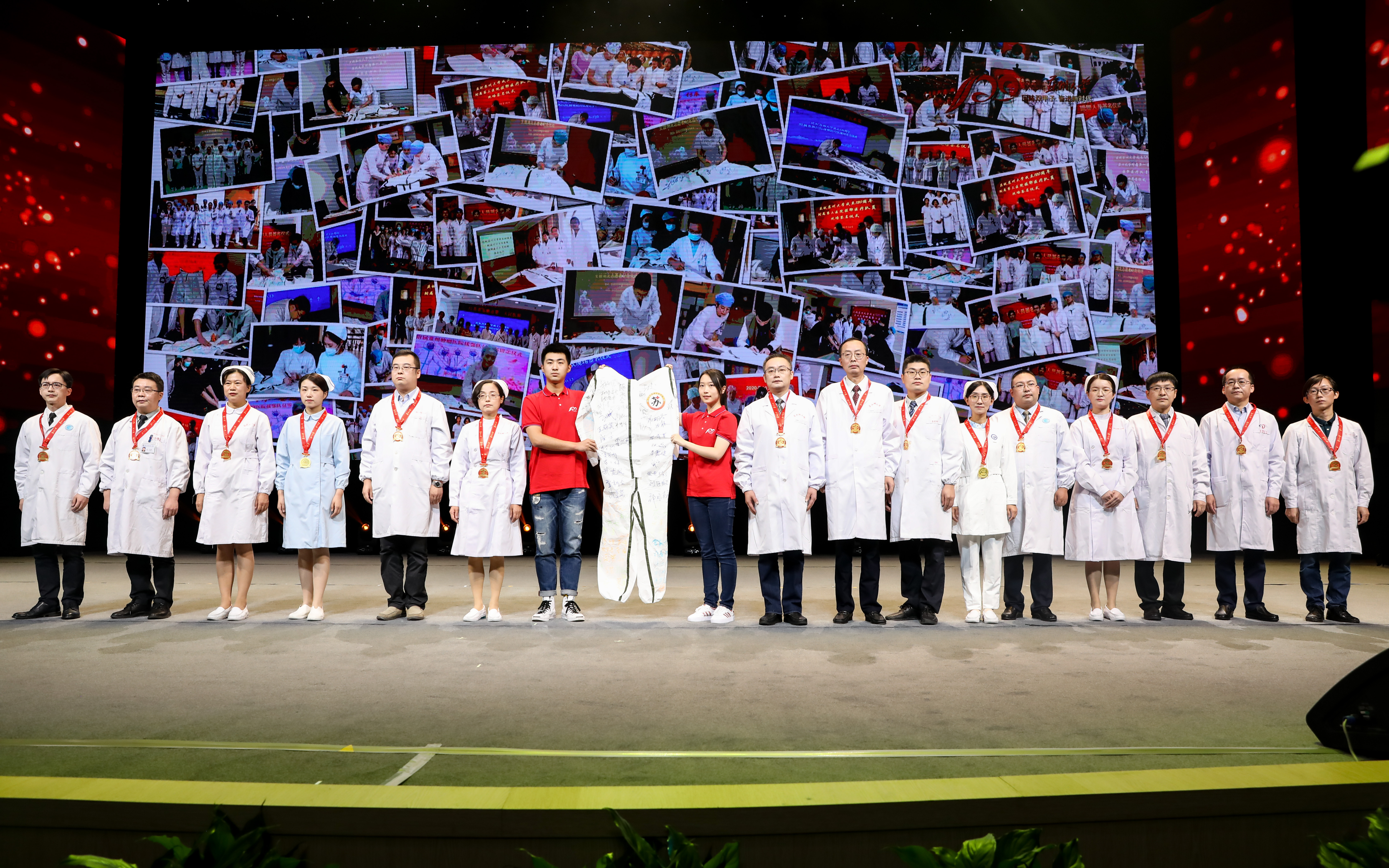 120年来,服务国家、奉献社会始终贯穿着苏州大学的发展。今年年初,新冠肺炎疫情突如其来,苏州大学 12 家附属医院的204 名医务人员出征驰援湖北。发展大会上,附属医院的援鄂英雄们,用一件签满姓名的防护服向母校献上生日礼。这件签满了 204 名抗疫英雄名字的防护服,将被苏州大学博物馆永久收藏。而苏大学子也将把这份医者仁爱之心代代传承。