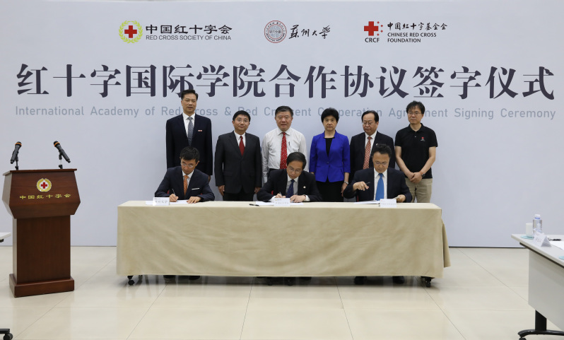 6月30日,中国红十字会总会、苏州大学、中国红十字基金会在京签署创办红十字国际学院合作协议。全国人大常委会副委员长、中国红十字会会长陈竺出席签字仪式,并与中国红十字会党组书记、常务副会长梁惠玲,中国红十字会副会长兼秘书长王平,我校党委书记江涌、副校长杨一心,中国红十字基金会常务副理事长兼秘书长孙硕鹏等领导一起见证了协议签字。签字仪式由梁惠玲主持,中国红十字会副会长王汝鹏、我校校长熊思东、中国红十字基金会理事长郭长江分别代表合作方在协议上签字。