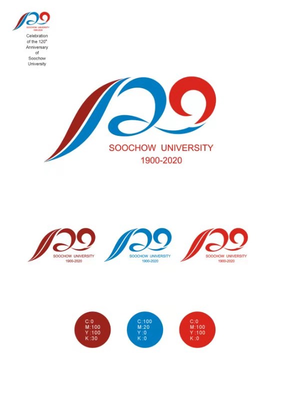 苏州大学庆祝建校120周年LOGO,整体上由双1和120构成,分别表达了苏州大学勇创双一流高校和建校120周年的深刻内涵。其中1的造型,一是以水的波型表达了苏州大学地处江南水乡及水文化所拥有的适时应变的灵性;二是以字母“S”的造型形式既代表苏州大学,也表达了学校深深扎根于天堂苏州这片沃土;三是以树叶的造型形式,代表了苏州大学建校、成长的历程。 LOGO的色彩从左至右依次采用了绛红、天蓝和大红,绛红表达了苏州大学悠久的办学历史和深厚的文化底蕴;天蓝代表了苏州大学与时俱进的科技、创新、豁达、融合的发展理念和宽广的发展视野;大红则表达了苏州大学热烈、激情、锐意进取的发展动力和美好的未来。